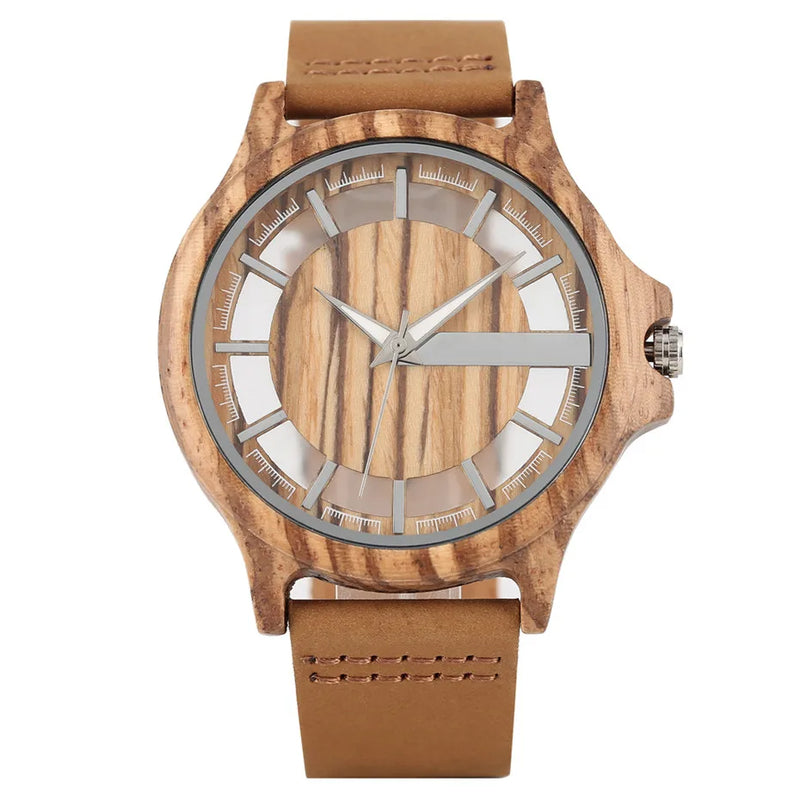 vastara transparent hollow dial coffee/brown/black wood es genuine leather band creative 's watch 24 - casual unisex